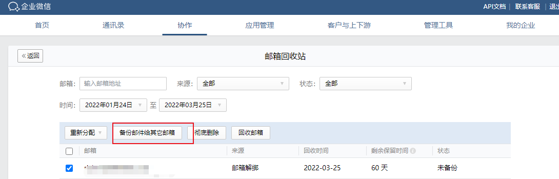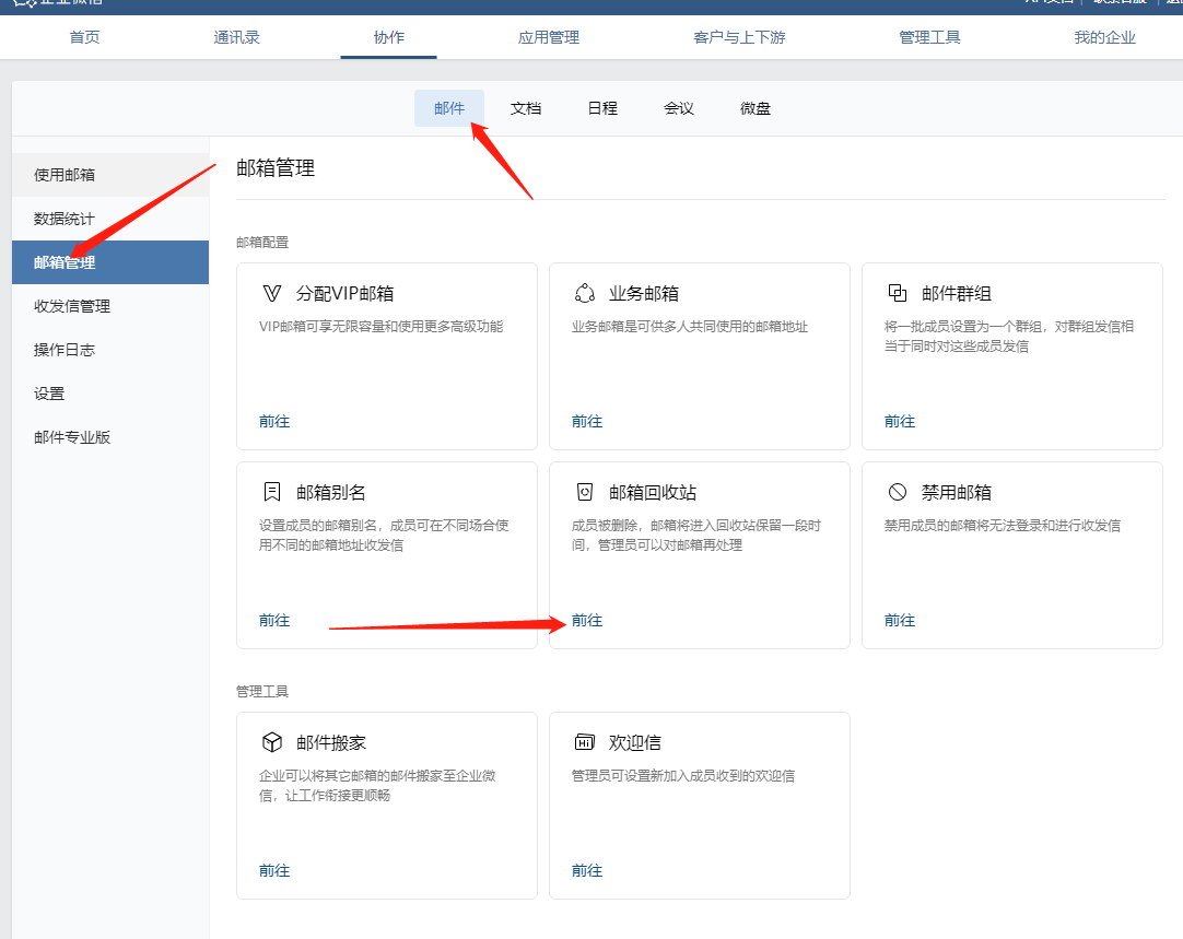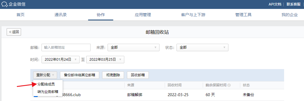 8、回收邮箱:若是需要更换邮箱绑定的企业微信账号,可以通过回收邮箱功能,将成员邮箱回收进回收站,再次重新分配给其他企业微信账号绑定使用。