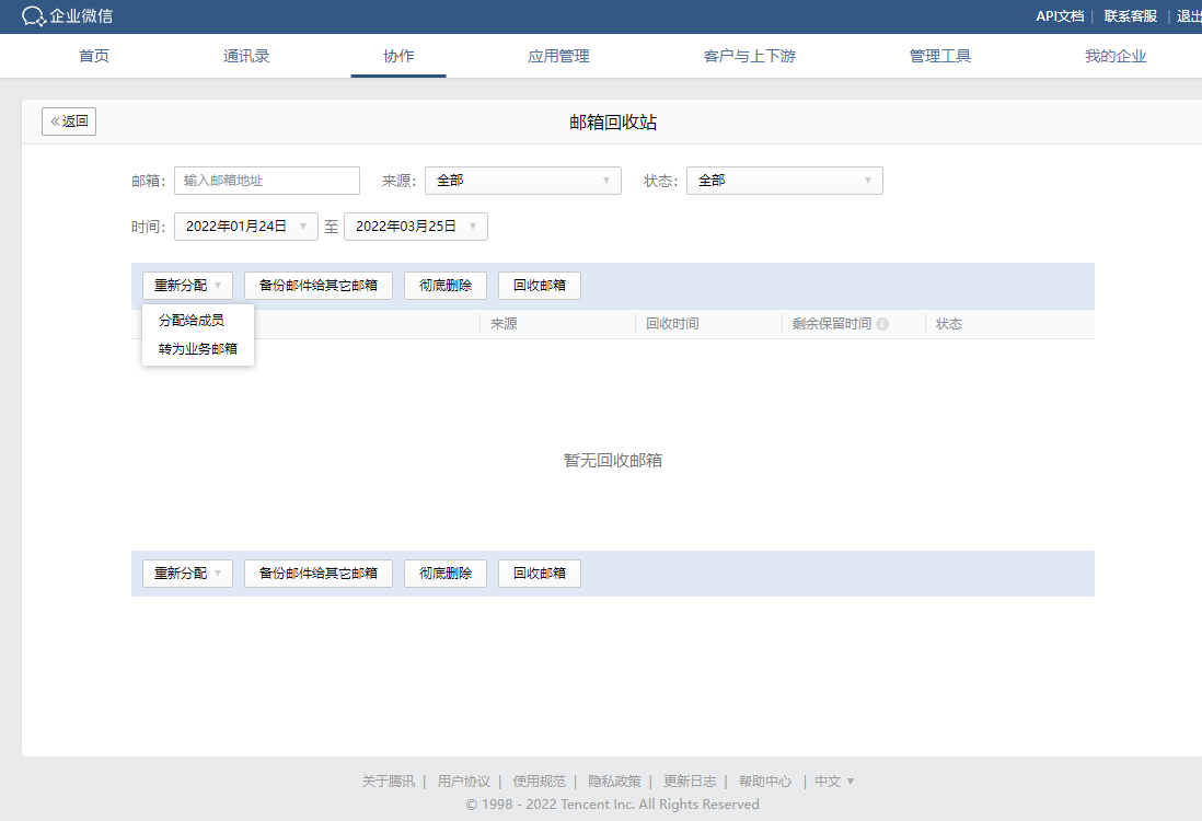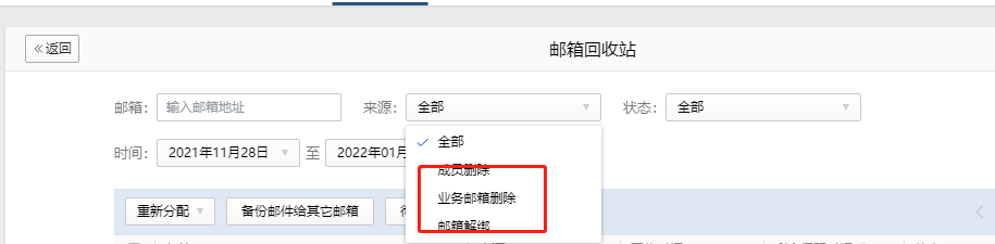 为了方便企业管理,简化管理功能,离职成员邮箱管理、待分配邮箱功能的历史数据移动至功能「邮箱回收站」下。删除成员账号、回收业务邮箱会进入邮箱回收站,管理员可通过回收站重新分配邮箱或备份邮件。