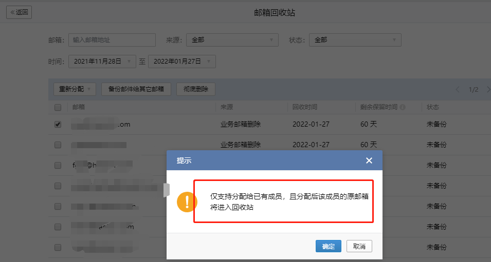 1、删除的成员邮箱至回收站保留30天、回收的业务邮箱保留60天,保留期间可以分配、备份邮件以及彻底删除操作。