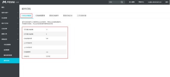 • 已开通归档邮箱:企业已经开通邮件归档服务的邮箱数。