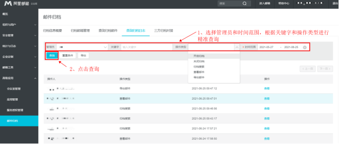 查看归档邮件:进入域管理界面,点击“统计与日志”--“查询归档日志”,选择管理员和时间范围,根据关键字和操作类型进行*查询。