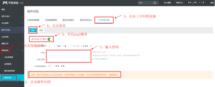 设置POP3密码:进入域管理界面,点击“*应用”-“邮件归档”-“三方归档对接”-开启“邮件归档POP3服务”-输入密码吗-点击“保存”。