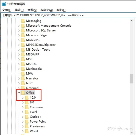 下面图片就是直接定位到office目录了,在这个目录下找到16.0/15.0/14.0/12.0(如果有多个这样的目录,证明你的电脑历史安装过其他版本,比如我之前安装2007现在安装2016了,卸载了2007在注册表的这个数据是不会被删除的,修改是不用理会多余版本只修改你当前安装的版本就可以了)这样的目录展开,如果不确定你的版本号应该是哪个,在下面有版本号对应。