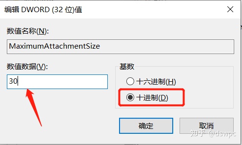 右侧如果有该键值MaximumAttachmentSize,双击会打开下图窗口,在窗口中默认是十六进制数,这个数和我们常用的数需要转换,我们没必要转换,我们选择十进制数就好了,比如我输入30就设置Outlook附件大小为30MB,直接点击确定就完成了,记得需要重启才能生效。