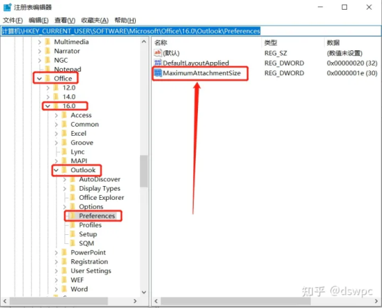 确定版本号之后展开这个目录,比如我用得office 2016 我就展开16.0的目录,在这个目录下找到outlook,展开outlook在找到Preferences,鼠标左键选择Preferences 在右侧查看是否有“MaximumAttachmentSize”这个键值。