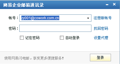Step 2:在上图示意的弹出框中,输入网易企业邮的帐号和密码,系统会自动完成企业通讯录同步,如果通讯录联系人较多,同步过程需要等待一定的时间。
