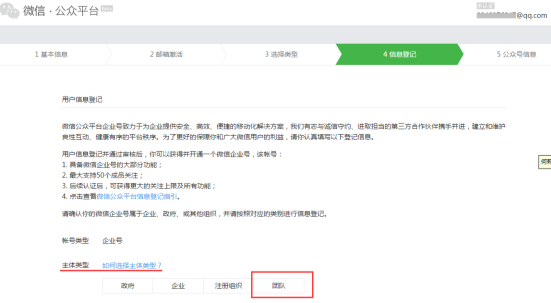 注册登记企业号信息时,主题类型请选择“团队”;如果您已经注册了微信公众号,则跳过此步;