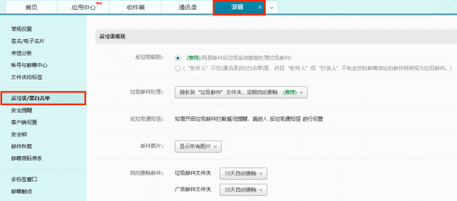 用户登录Webmail端企业邮箱,通过“设置>反垃圾/黑白名单”进入反垃圾/黑白名单页面。