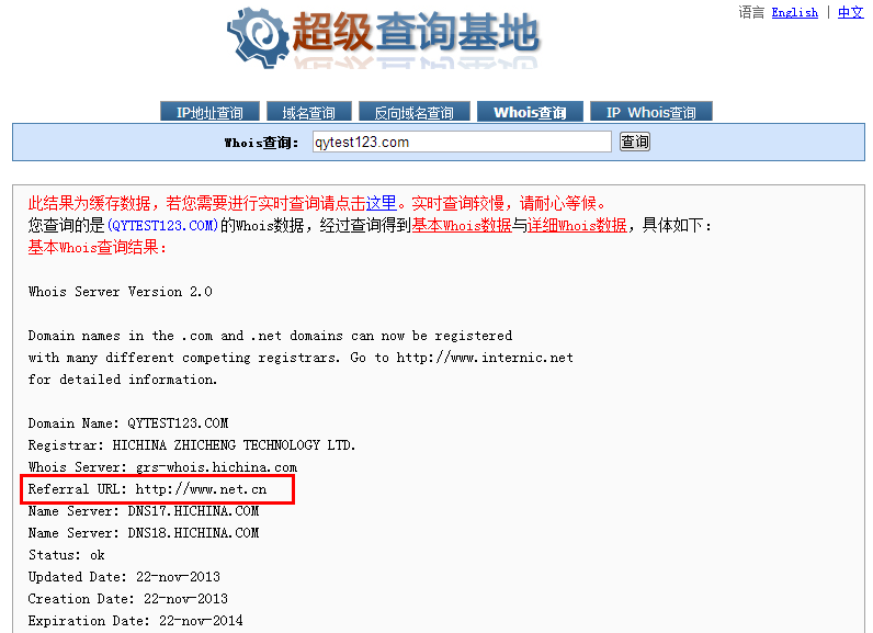 如下图,域名qytest123.com购买的网站是 http://www.net.cn