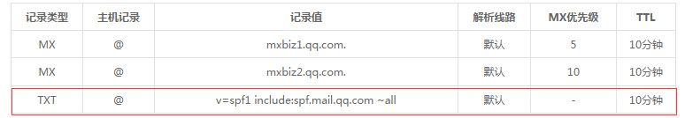 什么是SPF?如何设置企业邮箱的SPF呢?(TXT记录)什么是SPF? (Sender Policy Framework) 的缩写,一种以IP地址认证电子邮件发件人身份的技术,是非常高效的垃圾邮件解决方案。 接收邮件方会首先检查域名的SPF记录,来确定发件人的IP地址是否被包含在SPF记录里面,如果在,就认为是一封正确的邮件,否则会认为是一封伪造的邮件进行退回。 如何设置企业邮箱的SPF呢? SPF是通过域名的TXT记录来进行设置的。 为了提升域名邮箱发送外域(@qq.com以外的邮箱)邮件的成功率,建议您给自己的域名设置一条TXT记录来避免这种情况。 TXT记录值为:v=spf1 include:spf.mail.qq.com ~all 如图:万网的设置页面 1.从diy.hichina.com处登录域名管理系统; 2.在TXT(正文字串)处设置一条TXT记录,如下: ![]() |