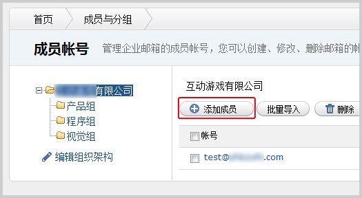 下面,我们以单个添加为例。 第一步: 登录企业邮箱地址exmail.qq.com,使用您的管理员帐号登录,这里假设您的管理员帐号为test。 第二步: 找到“成员与分组”标签,点击“成员帐号”。 第三步: 进入“成员帐号”页面后,点击“添加成员”。 第四步: 在“添加成员”页面,填写“基本信息”后,点击“确定”,完成成员帐号的创建。