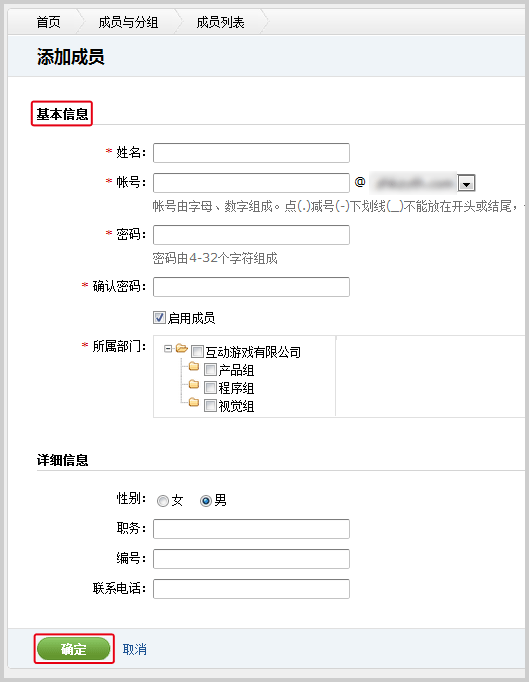 添加帐号时,可指定该帐号所属部门,在对应的部门上勾选即可。注意:一个成员可同时存在于多个部门,以满足企业员工身兼多职的需要。