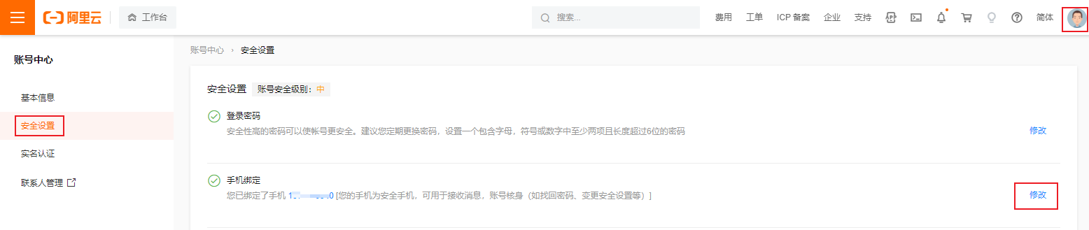 如果阿里云会员号绑定的手机不可用,可通过以下方法更换阿里云会员号绑定的手机,点击 头像->基本资料->安全设置->手机绑定-> 修改。