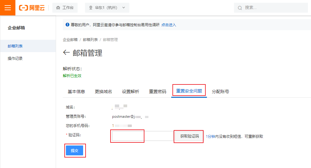 登录阿里云->控制台->产品与服务->企业邮箱->管理->重置安全问题,填写验证码->提交,即可完成安全手机和安全问题的重置。