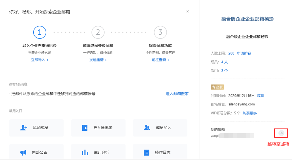 2.接收系统通知。如域名状态异常邮件、成员重置密码审批邮件等系统通知将会发到管理员邮箱。