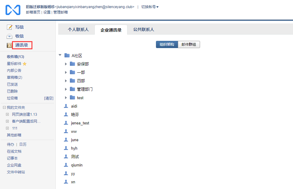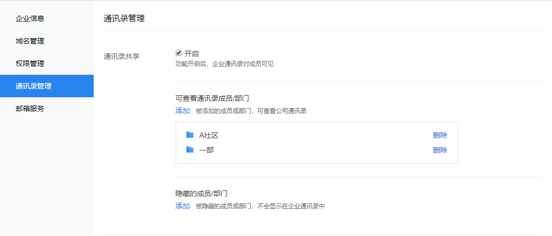 企业通讯录是由腾讯企业邮箱管理员设置,可被全体企业成员所共享的企业成员地址本。企业邮箱的管理员可以在我的企业-通讯录管理共享通讯录:当企业成员在写信时,可查看到同一个企业邮箱的其他成员的邮件地址,如下:在成员邮箱通讯录也可以查看企业通讯录。