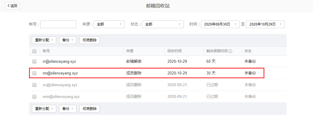 新版邮箱,可在删除邮箱30天内,管理工具-管理邮箱帐号-邮箱回收站分配给成员。(旧版邮箱,可在删除邮箱10天内,系统日志-操作记录恢复该账号)