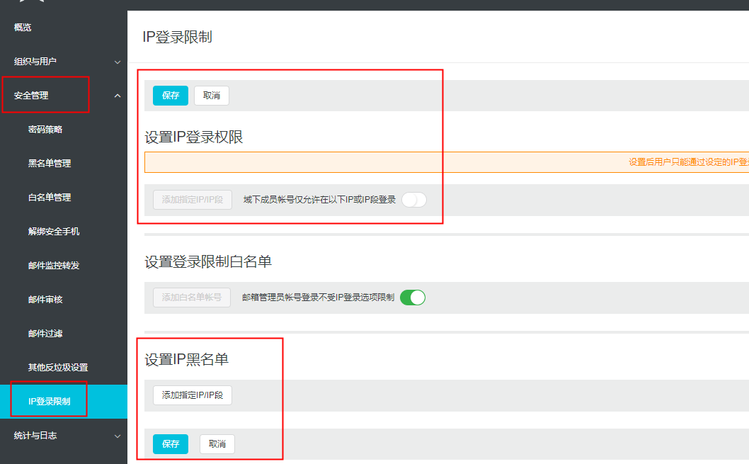 可通过 postmaster域管理 > 安全管理 > IP登录权限功能设置安全登录 IP,此功能限定可登录邮箱的 IP 地址,以避免被陌生 IP 尝试登陆使用,见下方位置: