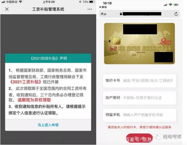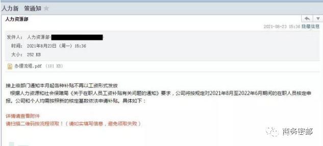 再利用企业邮件系统,仿冒人力、财务等部门,向员工的企业办公邮箱发送钓鱼邮件,一般通过 “补贴发放” “工资补发” 等具有吸引力的标题进行诱骗。受害人点击后,再以 “个税补缴” “发放补贴” 等名义诱导用户填入敏感信息。