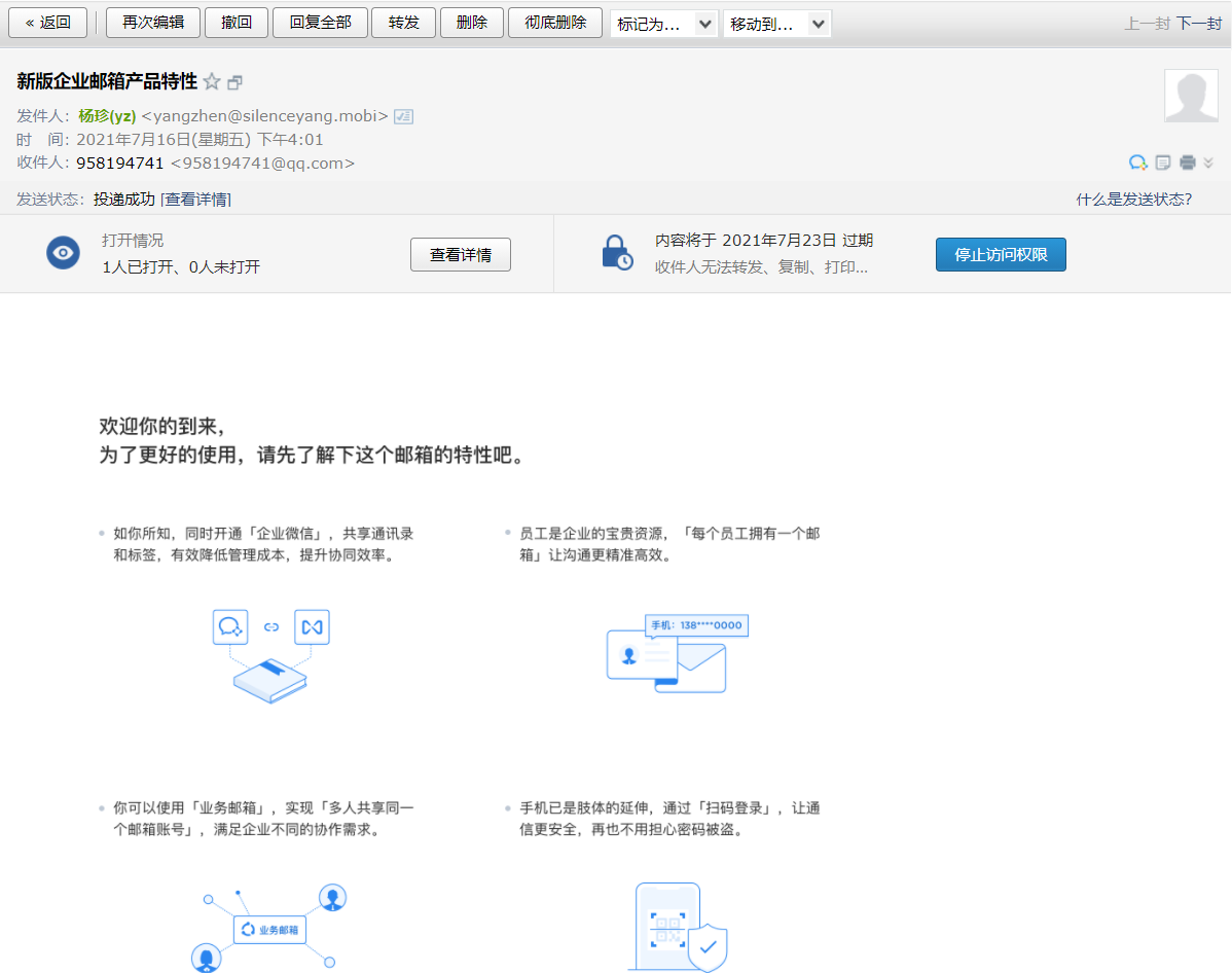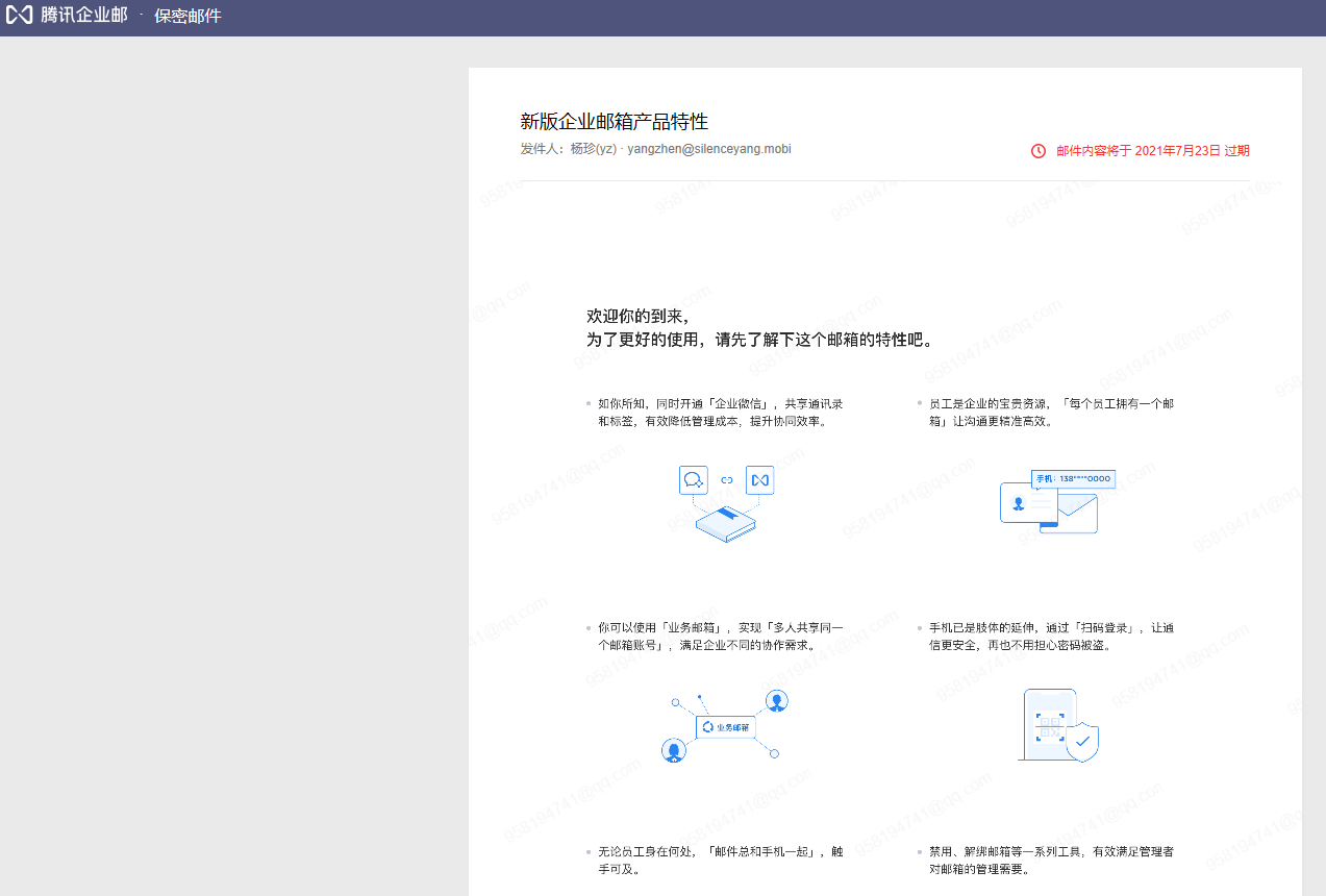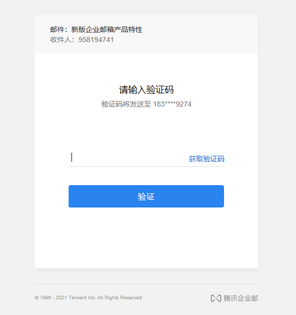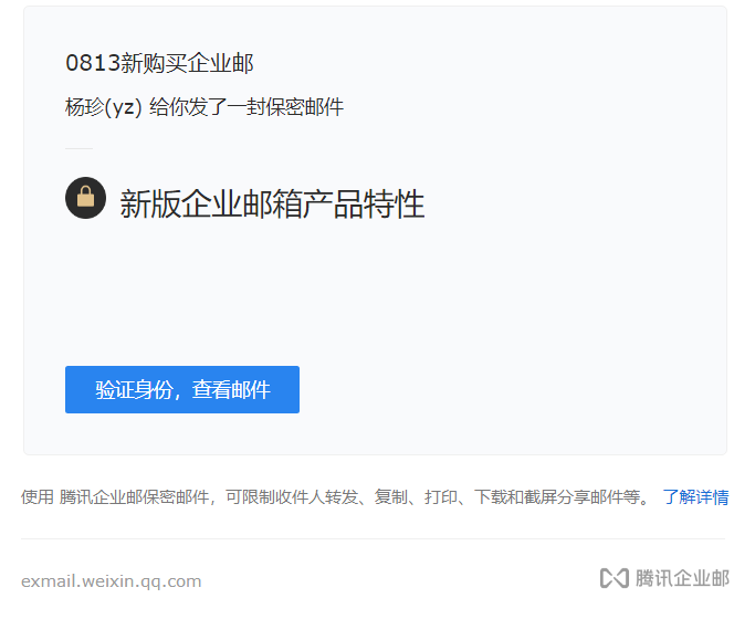 保密邮件,是腾讯企业邮提供的一种更安全的发信方式,可用于发送敏感信息。收件人需通过微信或手机号验证身份后才能查看,且无法转发、复制、下载和截屏分享邮件等。