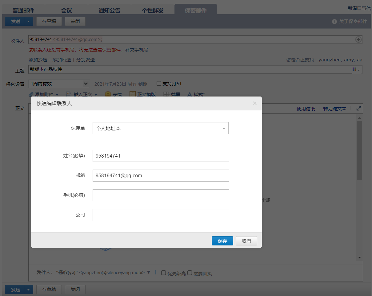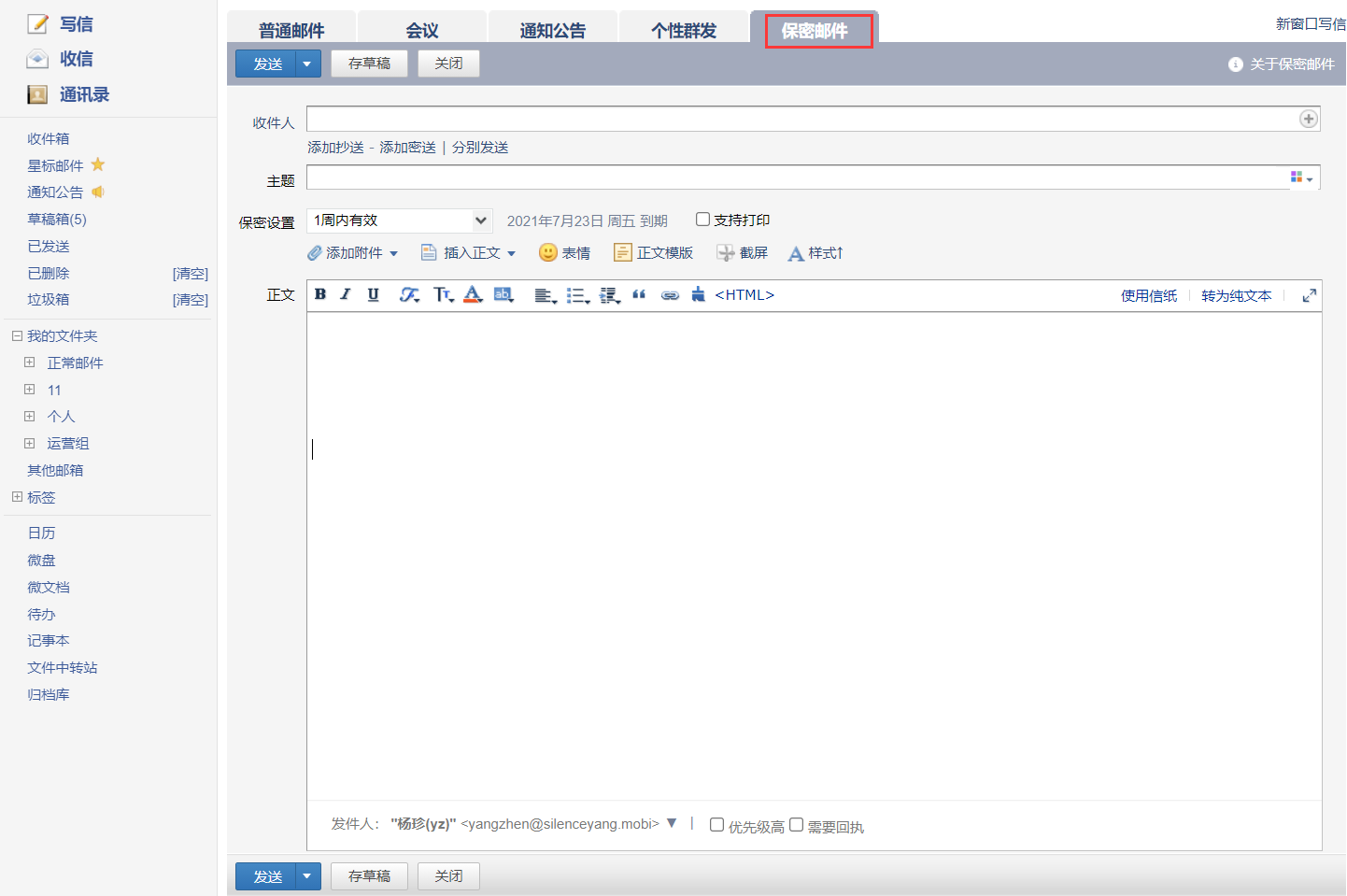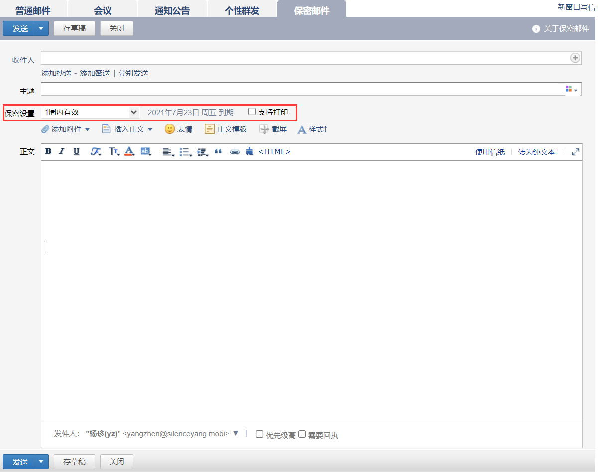 保密邮件,是腾讯企业邮提供的一种更安全的发信方式,可用于发送敏感信息。收件人需通过微信或手机号验证身份后才能查看,且无法转发、复制、下载和截屏分享邮件等。