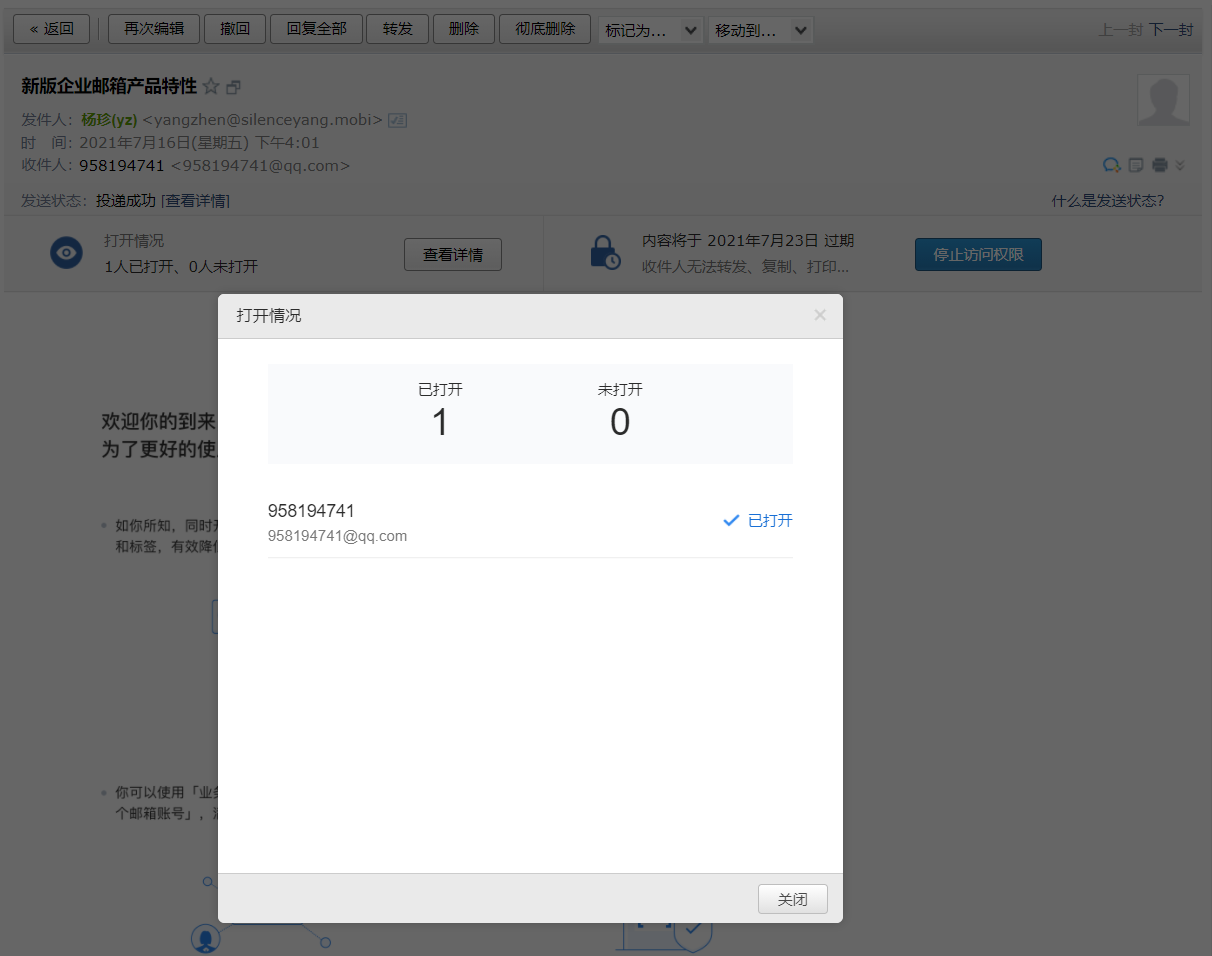 验证通过后可查看邮件内容。邮件内容不可复制并且显示水印。