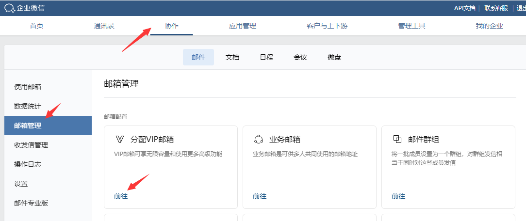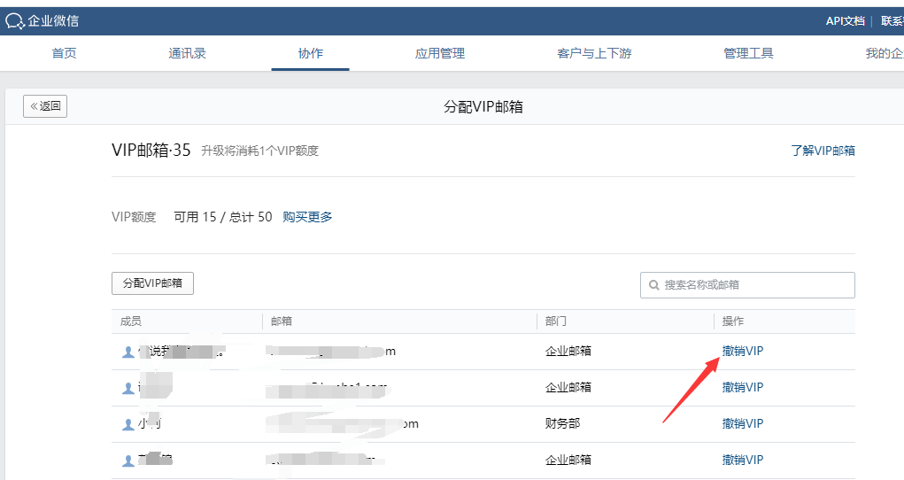 登录企业微信管理后台—协作—邮箱管理—分配VIP账号管理中选择“分配VIP账号”和“撤销vip账号”。