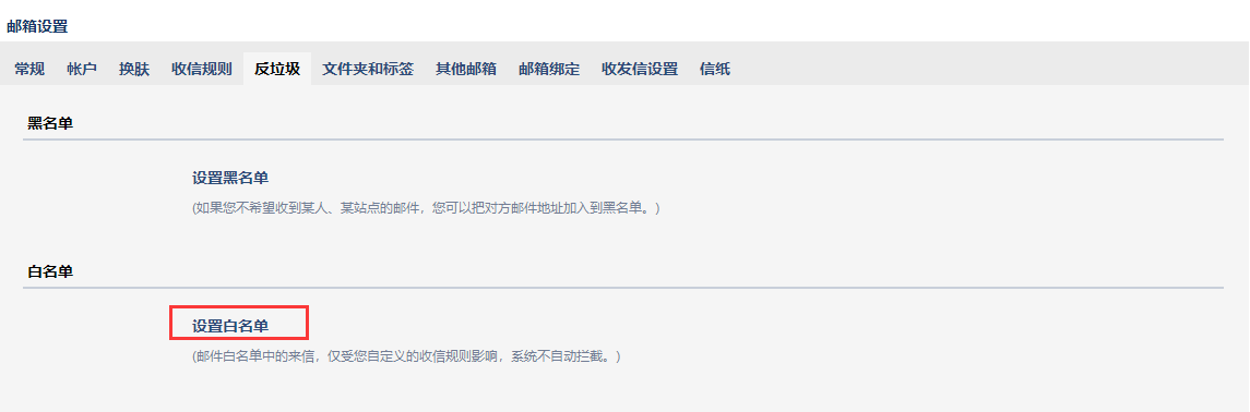 1.在“邮箱设置”->“反垃圾”->“白名单”栏目中,点击“设置白名单”。
