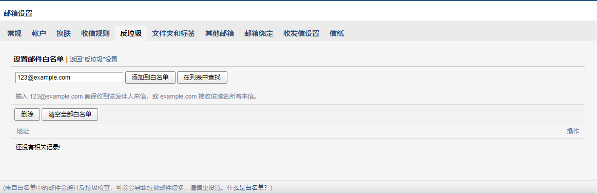 2.输入完整的地址,如“123@example.com或者example.com”,然后点击“添加到白名单”按钮,即可。