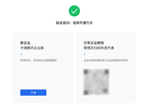 授权激活成功后,腾讯云提供以下两种企业邮箱开通方式,请您根据实际情况选择开通方式。如下图所示: