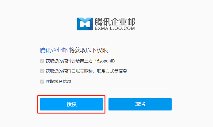 进入腾讯企业邮授权页,单击授权。如下图所示:
