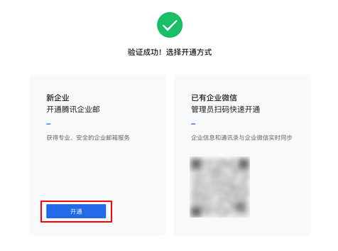 全新开通(未有企业微信):单击开通,即可进入开通企业邮箱流程。