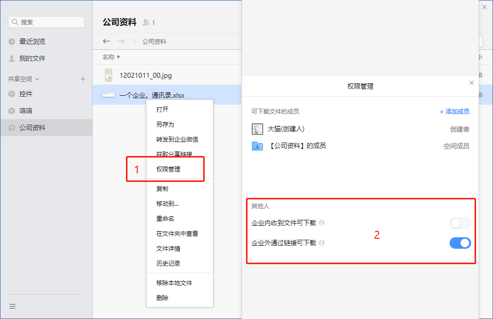 同一个共享空间内的人员无法禁止下载;若是空间外的人员或者企业外人员,可以在电脑端打开微盘—找到需要限制的文件—右击文件—权限管理—在其他人中关闭“企业内收到文件可下载”/“企业外通过链接可下载”进行禁止下载。
