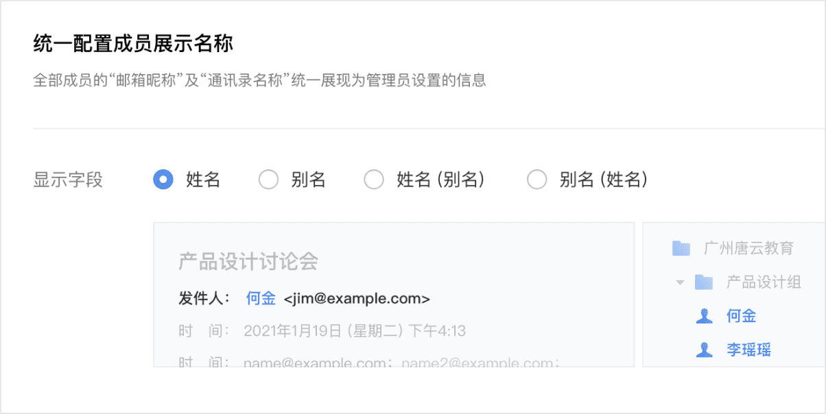 管理员可统一配置成员邮箱昵称及通讯录名称