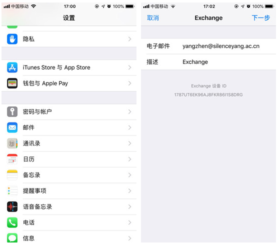 1.进入“设置”,选择“密码与账户”- “添加账户”-“Exchange”,输入天水电子邮件和描述,点击“下一步”
