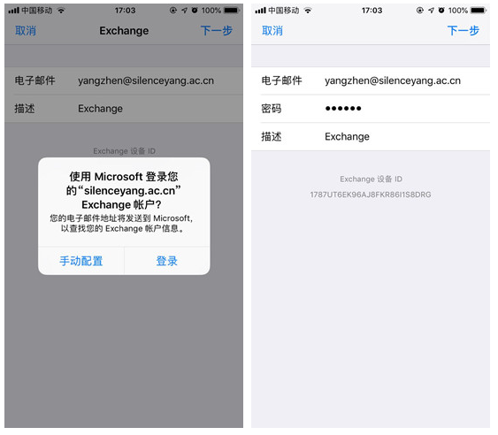 2.弹框提示“使用Microsoft 登录您的Exchange账户?”时,选择“手动配置”,然后输入天水电子邮件和密码(注意:如果邮箱已开启安全登录,请输入客户端专用密码)后,点击“下一步”