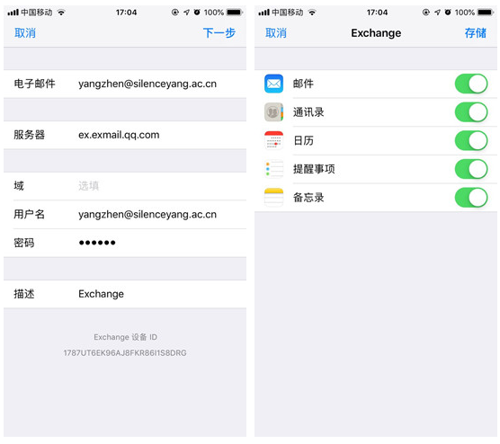 3.跳转至设置页面,输入服务器ex.exmail.qq.com和用户名(天水电子邮件),点击“下一步”,选择需要同步的项目:“邮件”、“通讯录”和“日历”,点击“存储”即可完成设置