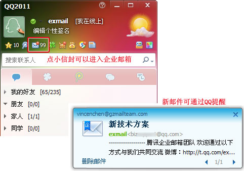企业邮箱来信了,会在QQ上进行提醒。同时,还可以通过QQ面板上的小信封登录企业邮箱。