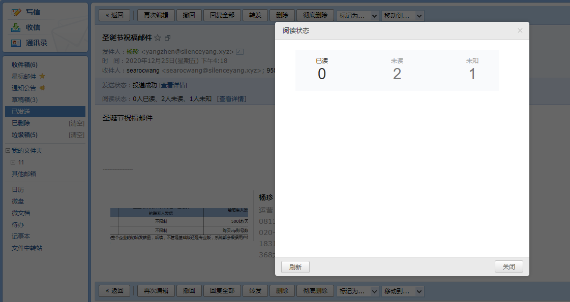 如管理员开启了邮件阅读状态功能,那么成员发送普通邮件、日程、通知公告、个性群发邮件后,可在已发送查看企业内部收件人的阅读状态。 关于邮件阅读状态功能