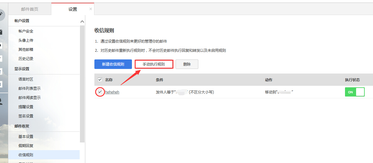 2.手动创执行规则:登陆企业邮箱,单击页面右上角的设置,在设置页面中,单击左侧列表【收信规则】,选中要启用的分类规则,单击手动执行规则,选择要执行规则进行分类的类别即可。