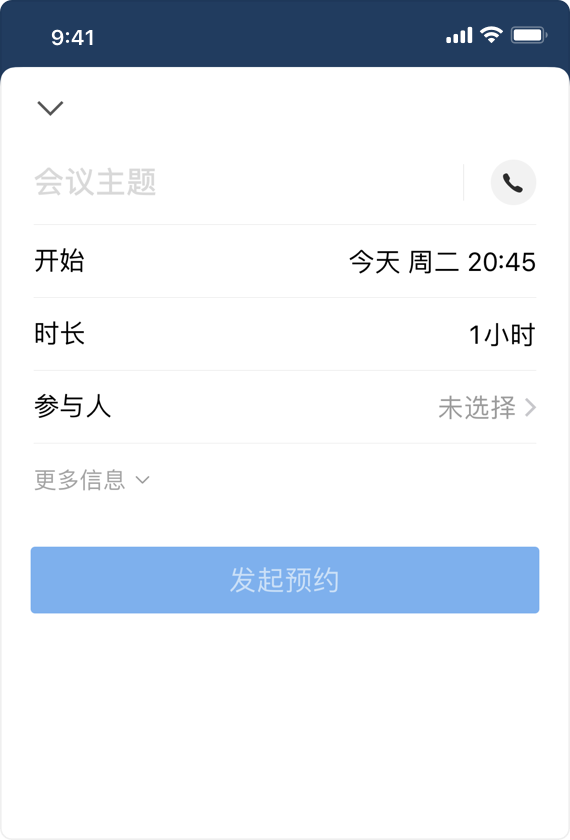 1)进入工作台-会议应用,提前发起会议预约,预约后成员会收到预约提醒并选择接受/待定/拒绝。预约时需输入会议主题,选择会议类型、会议时间及参与人,也可添加会议其他相关说明到备注中。