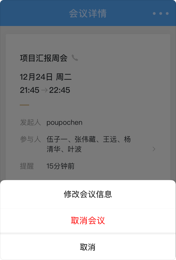2.预约的会议,发起人可在工作台-会议应用中进行查看、修改及取消,也可在到达预计时间点前提前开始会议