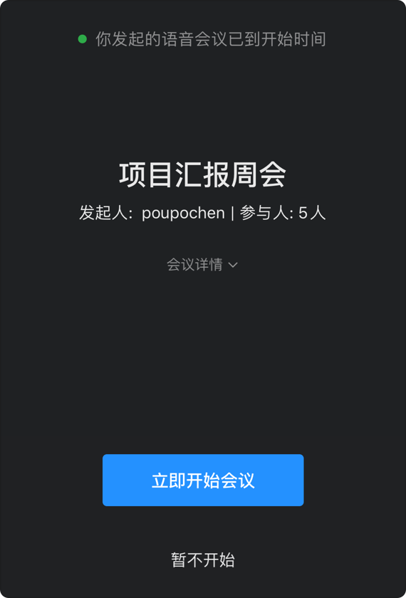 3.到达预约的开始时间时,发起人将收到提醒,可一键开始会议。开始后,其他成员将同时收到来电通知快速进入会议