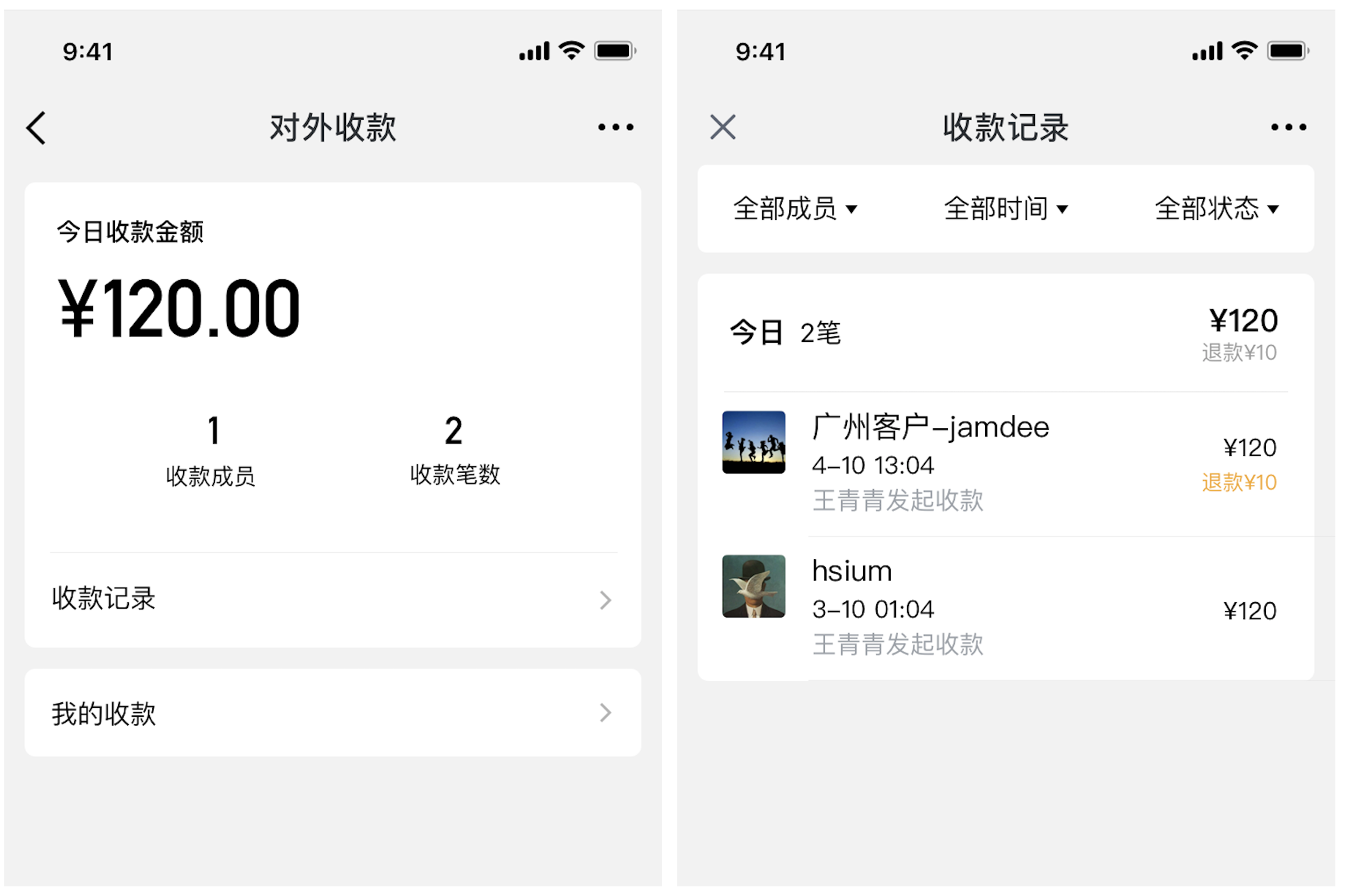如何查看收款明细:在「工作台-对外收款」中,可以看到企业的当日收款卡片以及企业历史收款明细,进入后可以按成员、时间、状态进行条件筛选查看。