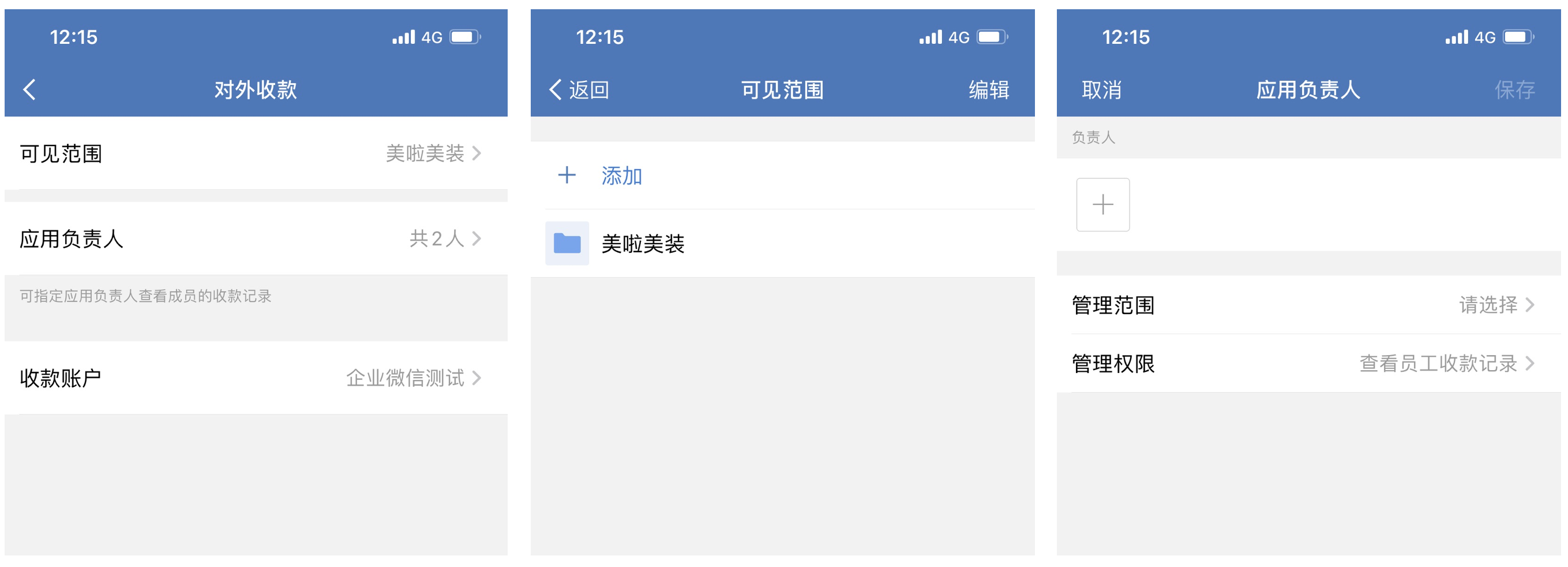 管理后台:登录work.weixin.qq.com,在「应用管理-对外收款-可见范围/应用负责人」进行设置。