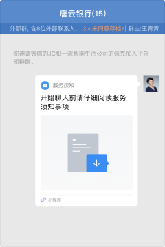 针对金融行业特性,企业微信支持金融服务质量合规审计、通过连接微信帮助金融机构为客户提供合法合规的金融服务,满足企业内部管理和金融行业合规监管需求