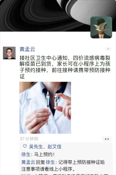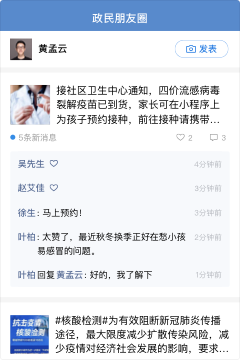 成员可将重要通知、政务党务、活动信息等发表到居民的朋友圈,并与居民评论互动。政府可查看成员发表的内容,也可统一创建内容,成员确认后发表到居民的朋友圈。