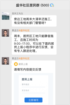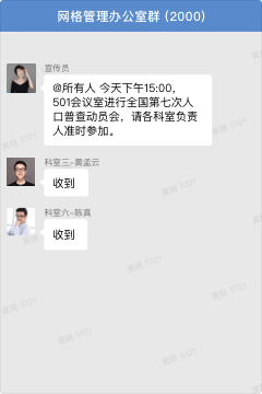 政府可按照网格,创建官方的政民沟通群。政府可将重要通知、活动信息等群发到居民群里,居民使用微信即可与政府人员进行沟通。居民群人数最高可达500人。