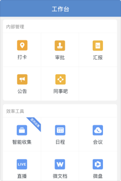 预设打卡、审批、公告、会议等OA应用,提供丰富的第三方应用,同时支持API接入自有应用。成员可在手机端便捷打卡(也可接入考勤机),提交请假报销、用车用章、公务接待等审批,接收重要通知,进行视频会议等。