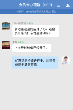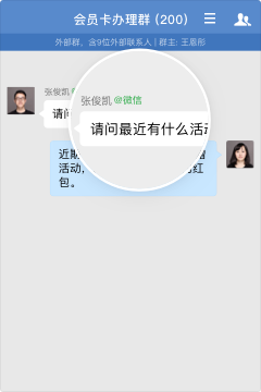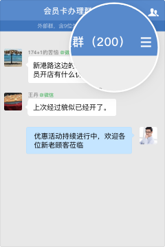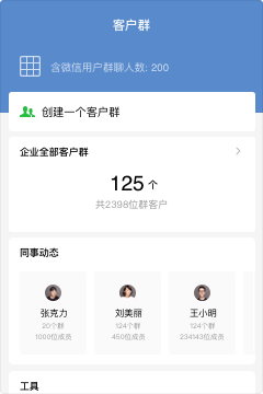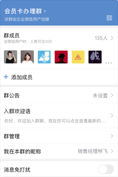 企业可查看并管理成员的客户群聊、对离职成员管理的群聊再分配。客户群人数最高可达200人